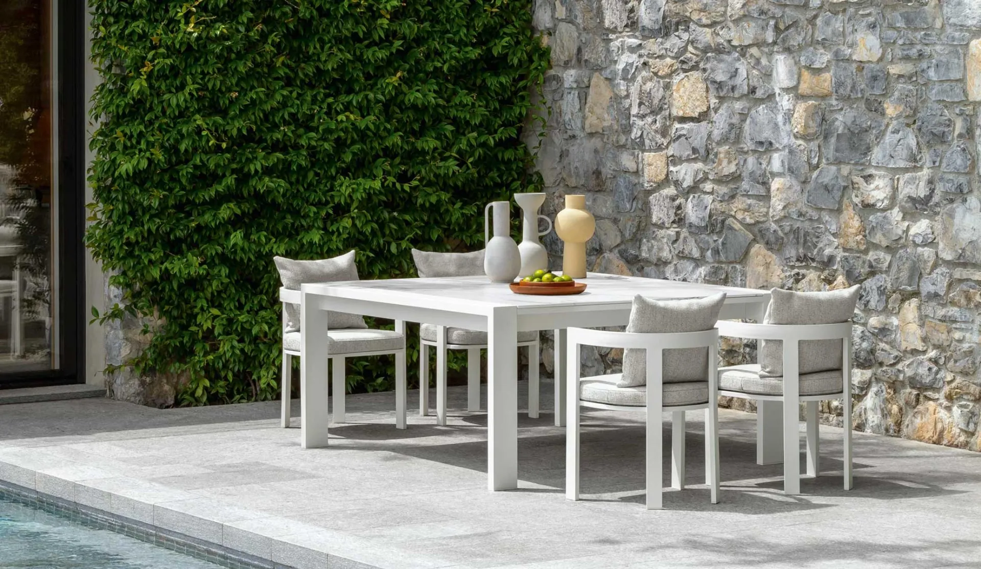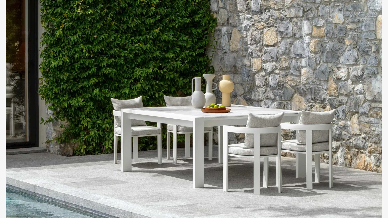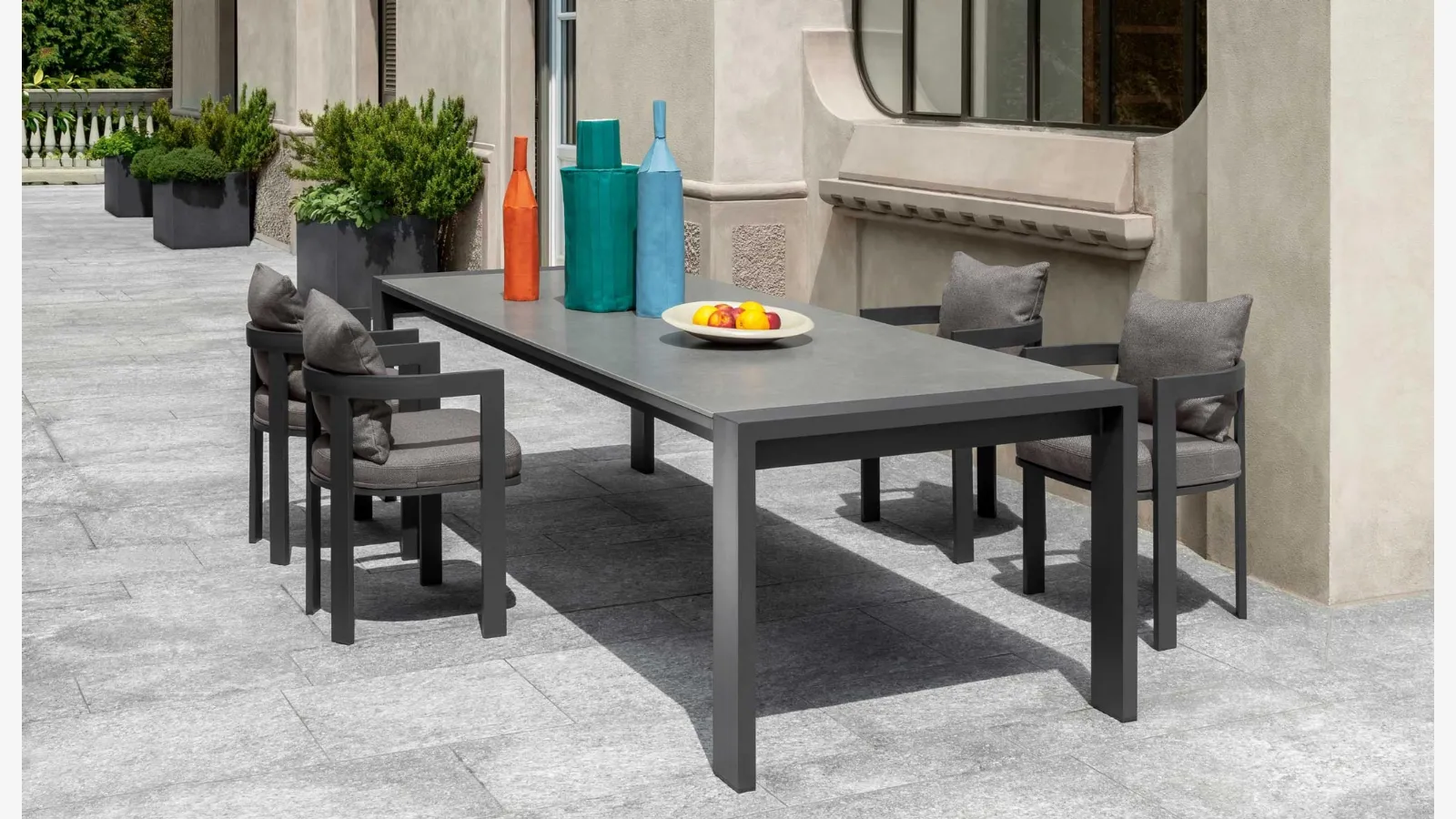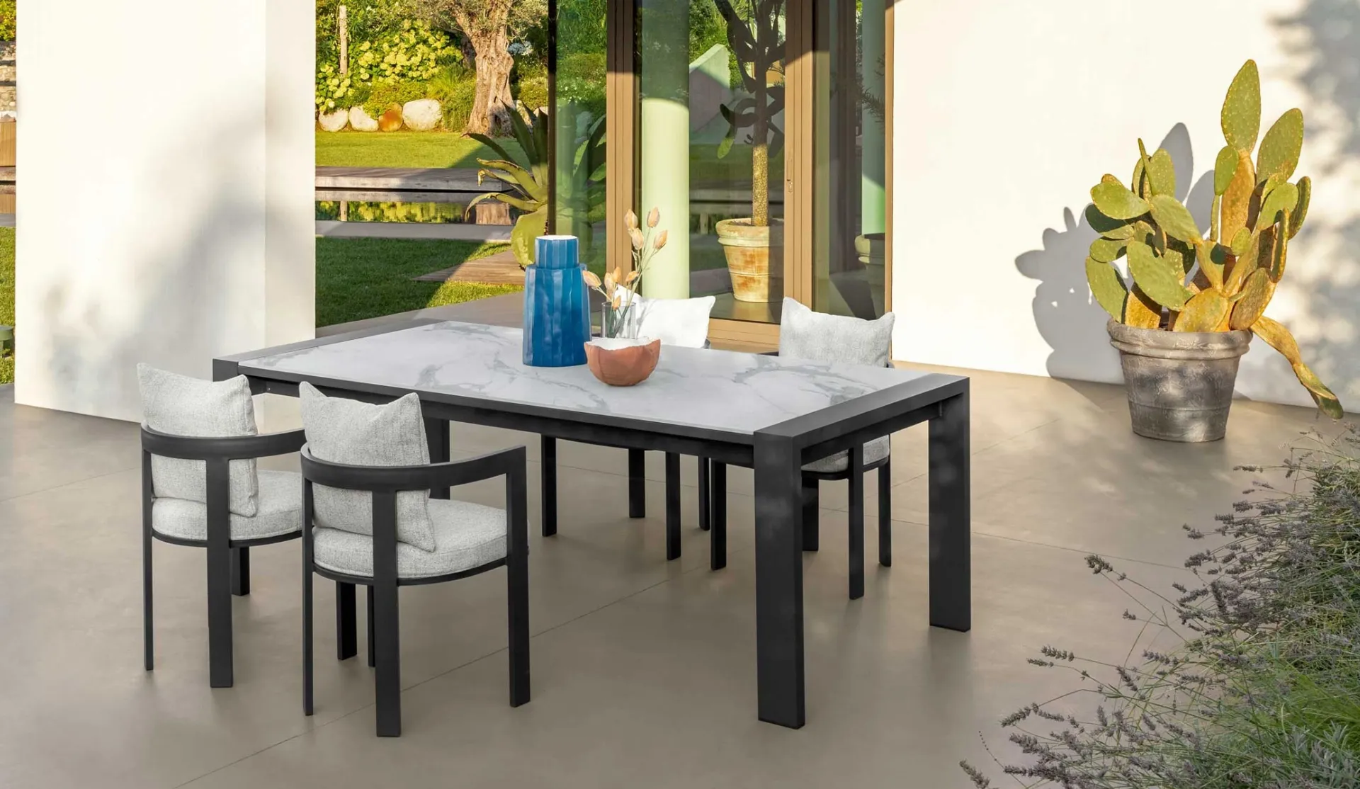 Talenti'nin seramik bahçe masaları serimizi keşfedin: Fotoğrafta görülen Argo Alu Masa ve Sandalyel