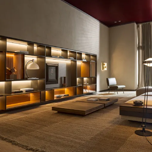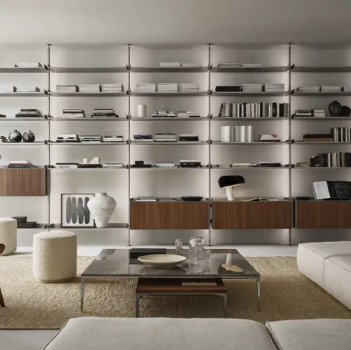 Tıkla ve modern duvar kitaplıklarını keşfet! Molteni & C'in 505 UP SYSTEM 02 modeli, dinamik ve işlevsel bir oturma odas