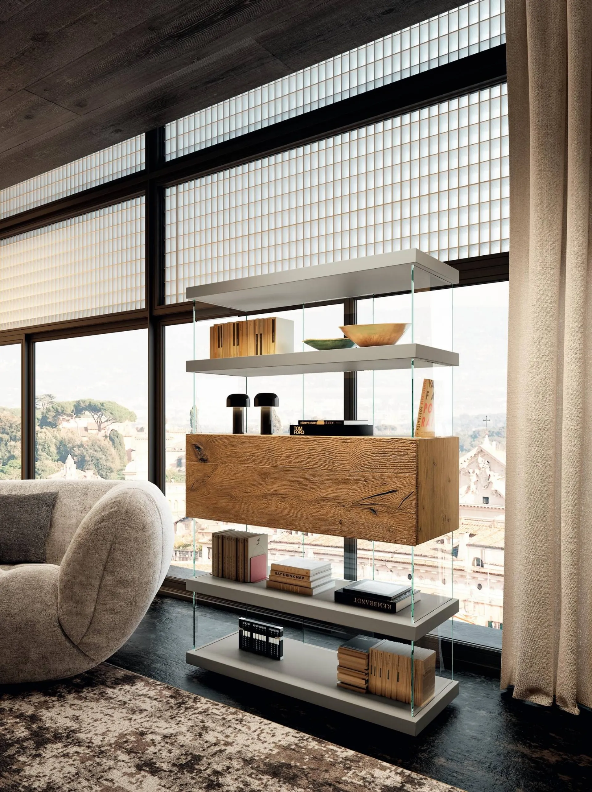 Fotoğrafta görülen model Lago'nun tasarım bölücü kitaplık koleksiyonunun bir parçasıdır