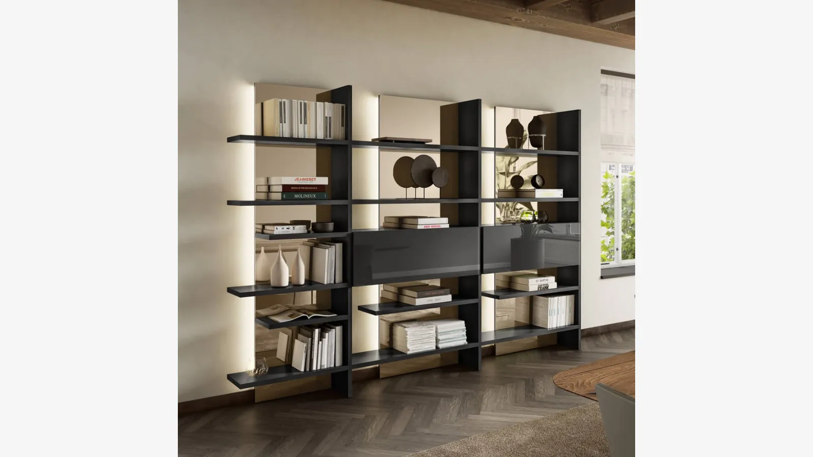 Oturma odası mobilyaları arasında duvar rafları gibi, kitapları, dergileri ve çeşitli eşyaları tutarak düzenli bir alan yaratmanıza olanak tanır. Oturma odasını dekore etmek kolaydır: Ortamı dekore etmek ve mekânın atmosferini vurgulamak için doğru türde kitaplık seçin. Parlak laker kaplamalı, sağlam, fonksiyonel, güzel ve özenle tasarlanmış bir kitaplık isterseniz, modern çözümlerimizi incelemek sana uygun olan modeli bulmanda yardımcı olacaktır. Lago'nun entegre aydınlatmalı modüler duvar kitaplığı Pentagram, dinamik, işlevsel ve estetik değeri yüksek bir alana mükemmel bir şekilde uyum sağlar. Oturma odanızı en iyi şekilde düzenlemek mümkündür: Fotoğraftaki kitaplık modeli hakkında daha fazla bilgi almak için bize ulaşın ve tanınmış ve saygın markanın sağladığı