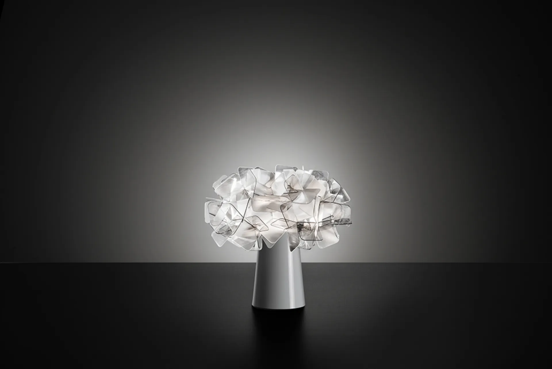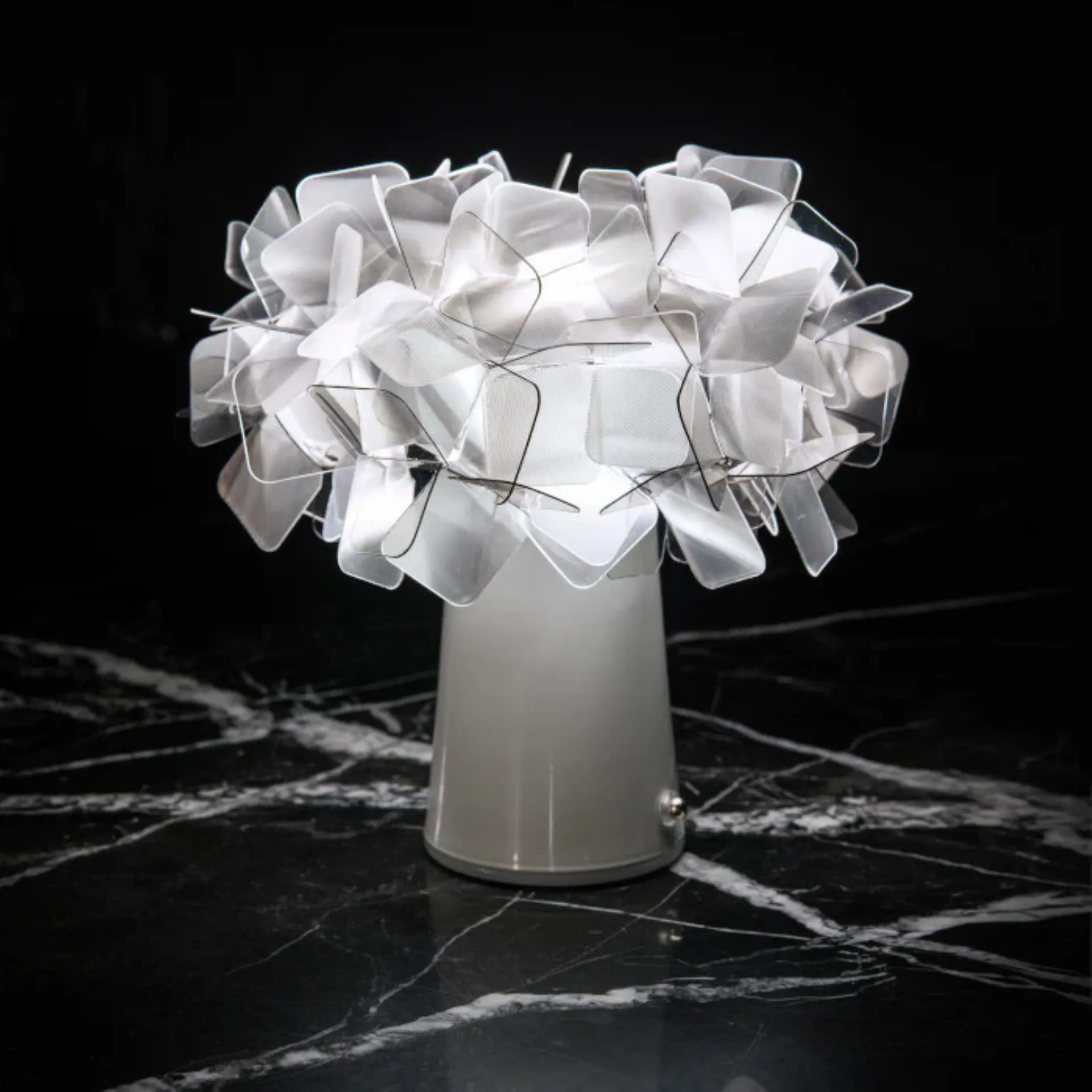 Clizia'nın parlak taç yaprakları, cömert ve yumuşak tasarıma sahip bir masa lambası olup, geri dönüşümlü malzemeden yapılmıştır ve sadece takım işçiliği ile monte edilir, görünür vidalar olmadan veya yapıştırıcılar olmadan. Bu masa lambası, lambaları değiştirmek ve ürünü en rahat şekilde temizlemek için aydınlatma kaynağından yayı ayırmak için manyetik bir bağlantıya sahiptir.