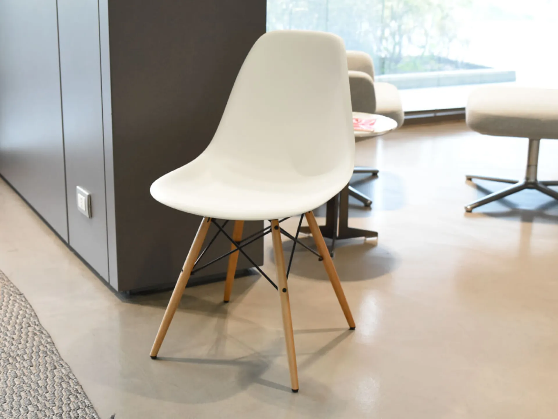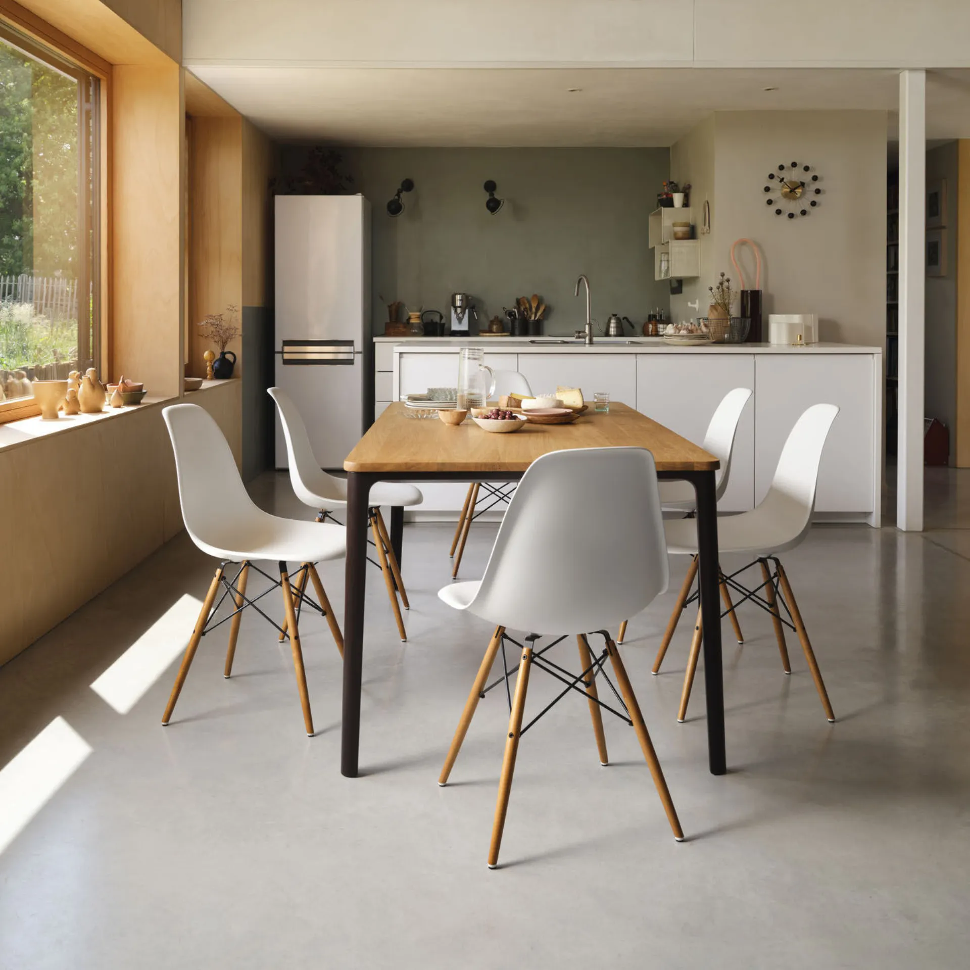 Dining Height SIde Chair Wood Base (DSW) için, Charles ve Ray Eames organik şekilli kabuğun, şimdi Vitra tarafından geri dönüştürülmüş post-tüketim plastikten üretilen, dört ahşap bacaklı bir tabanla birleştirdiler. Bu karşıtlık plastik ve ahşabın bu klasik modele çekici, sıcak ve rahat bir görünüm kazandırır. Kabuklar, geniş bir kumaş renk seçeneği ile tam dolgulu yastıklar veya koltuk minderleri ile donatılabilir, bu da çeşitli bireysel konfigürasyonların mümkün olmasını sağlar. Ahşap tabanlı direkler: Akçaağaç ağacı tonlarda sarı ve siyah boyalı metal Sentetik malzemeden kabuk: Beyaz renk Boyutlar: U.46,5 cm D.53 cm Y.83 cm Tüm fiyatlar KDV dahil olarak belirtilmiştir.