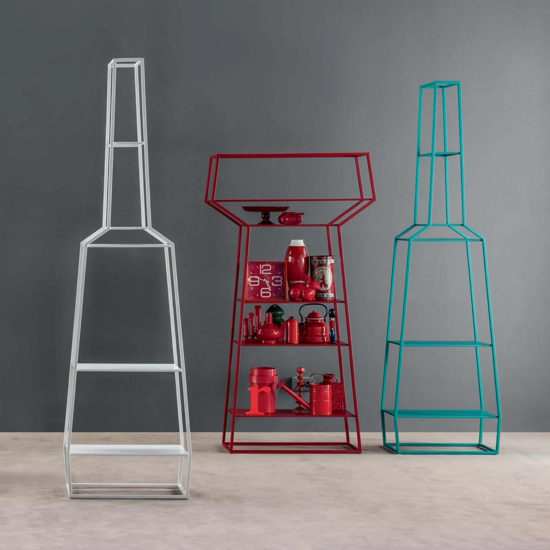 Mat metal ile boyanmış mat beyaz renkli May rafları, Bonaldo'nun yaşam alanlarında da kullanılabilen bir kitaplık veya destek yüzey olarak hizmet verebilir. Her rafın maksimum taşıma kapasitesi 5 kg'dir.