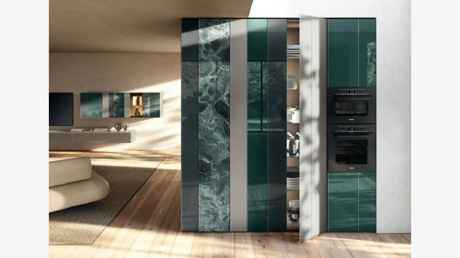 Mobilya kişiselleştirmesi tasarım açısından anahtar bir unsur ise, alanlarınızın dekorasyon projesinde Lago markasının Köşe Mutfakları'nı tercih etmenizi öneririm, burada görülen model gibi. Bu öneri camdan yapılmış olsa da, modülerliği ve kişiselleştirme imkanı sayesinde olağanüstü ve kişisel bir alan yaratabilirsiniz. Lago'nun Köşe Mutfaklarından NOW Project 2831'i satın alarak, modelin her parçasını mekanlarınıza uygun hale getirerek moda detaylarla benzersiz bir kompozisyon yaratabilirsiniz. Lago, mekânınızın kişisel konut ihtiyaçlarına ve estetik kaygılarına yanıt verebilecek güncel tasarımlar yaratmamıza olanak tanır, burada çizgilerin ve boyutların artık s
