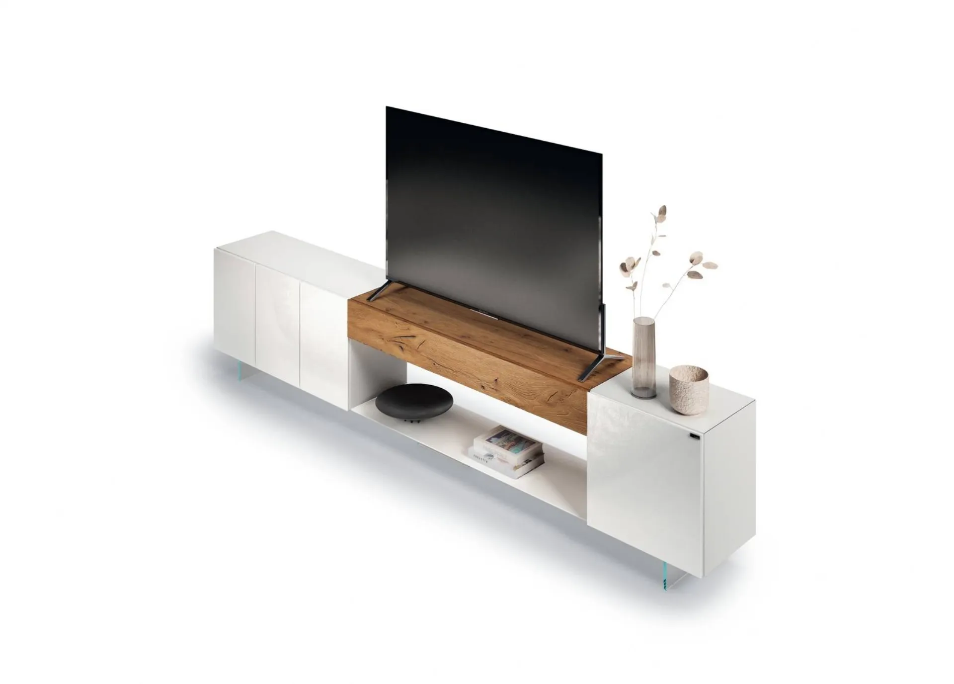 TV üniteleri, dikkatlice seçildiğinde oturma odanızı tamamlayarak objeleriniz, televizyon ve diğer eşyalarınız için çok yönlü bir destek yüzeyi olarak hizmet eder. Yararlı ve yüksek estetik değere sahip olan cam TV ünitelerimiz, modern mekanlar için alanları optimize ederek kişiselleştirir. Televizyonunuzu, kitapları veya çeşitli objeleri saklamak isteseniz bile, fotoğraftakine benzer bir mobilya evinize estetik kazandırarak alanları zenginleştirecektir. Fotoğraftaki model Lago'nun modern cam TV üniteleri koleksiyonundan bir parçadır: mağazamızda piyasada bulunan en güzel teklifleri bulacaksınız. Oturma odasında günlük yaşamımızı kolaylaştırarak ve özgün atmosferler yaratarak bizi evde eşlik eden mobilyalara ihtiya